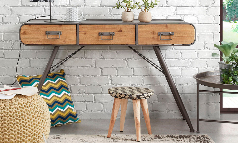 Если вам нравится сочетание искусственных и натуральных материалов, ознакомьтесь с консольным столиком Rotcip. Металлическое основание окрашено в темно-алый цвет, напоминающий чем-то вишневый. Изящность силуэта подчеркнута размерами: сверху длина составляет 120 сантиметров, в то время как внизу – на 10 сантиметров меньше. Как и другая эргономичная консоль, Rotcip от La Forma является узкой – всего сорок сантиметров, чего вполне хватает для размещения декоративных элементов интерьера. Благодаря своим размерам фурнитура легко впишется в компактную прихожую.