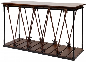 Модный и востребованный винтажный стиль также предполагает использование столов- консолей. Тут они имеют весьма неповторимый вид: создаются путем ковки из металла, покрываются черной краской, имеют массивные столешницы. Ножки стоит делать изогнутыми, допустима даже их легкая кривизна, асимметрия. Такая консоль точно заставит своего владельца ощущать ностальгию и теплоту прошлых времен.