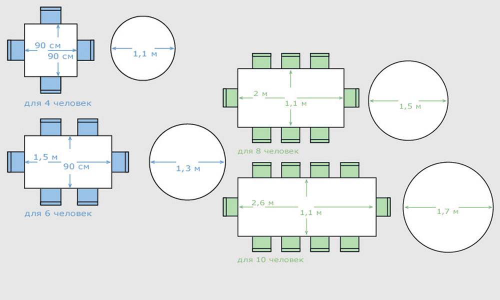 Овальный стол. Привлекает внимание не меньше чем круглый, округлые формы помогают использовать стол для того что бы рассадить максимально много человек по сравнению с квадратными столами. По подходящим габаритам для максимально комфортного использования стоит исходить из следующих рекомендаций: четыре-шесть человек ширина 90 см длина 140 см, семь-восемь ширина 90 см длина 180 см, девять-десять ширина 90 см длина 210 см.