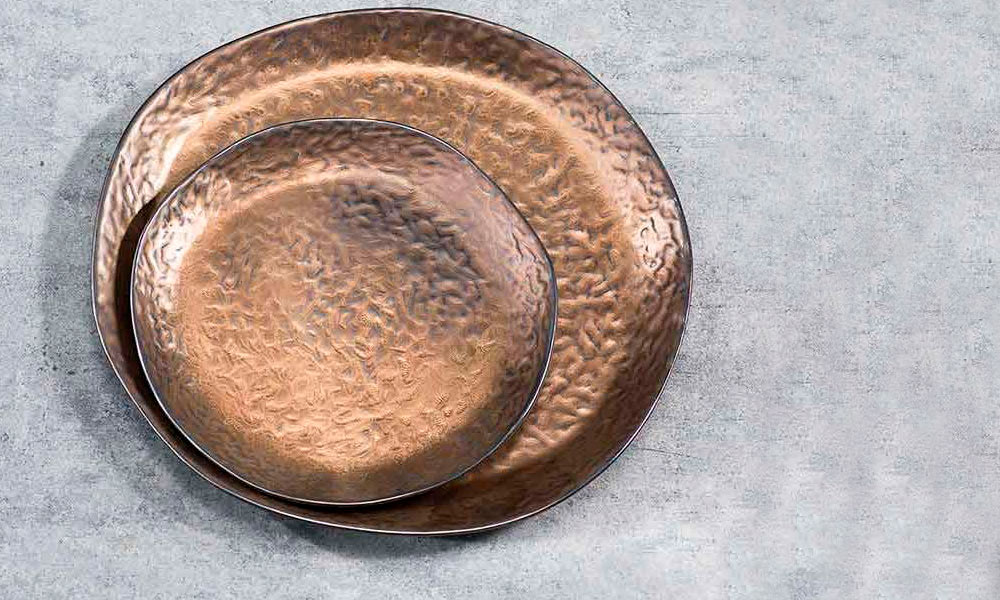 - текстура и расцветка тарелок, чайных и кофейных чашек, менажниц стилизованы под “состаренную медь”. Гладкая поверхность изделий усеяна мелкими бугорками, неровности и края изделий подчеркнуты “потемнениями металла”. Такое решение позволило придать комплекту посуды особенно уникальный, “теплый”, “душевный” облик, чарующий “налет старины”. Предметы подходят для сервировки как праздничных, так и повседневных застолий. Благородный оттенок натуральной меди позволяет вещам смотреться изысканно и дорого, он - нейтральный, естественный, поэтому приятен глазу и не раздражает. На его фоне любая пища смотрится ярко, особенно аппетитно, посуда Copernico идеальна для создания фотографий блюд;
