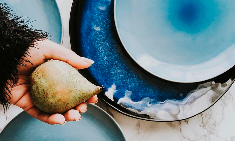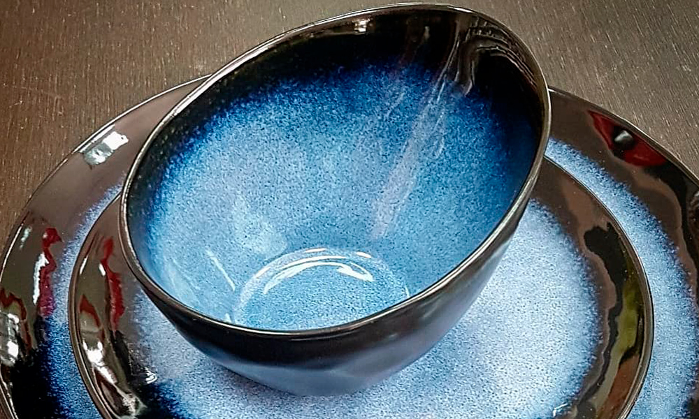 Особенностью одной из новых коллекций молодого бренда является необычная расцветка, ассоциирующаяся с блеском и роскошью драгоценного алмаза. Она создана лучшими дизайнерами, черпающими вдохновение из окружающего мира. Глубокий и очень насыщенный синий оттенок, преобладающий по кромке, постепенно светлеет к центру изделий. Это добавляет шарма сервировке и загадочности блюдам. Посуда напоминает природный камень не только визуально, но и тактильно, чему способствует шероховата и грубоватая поверхность керамики