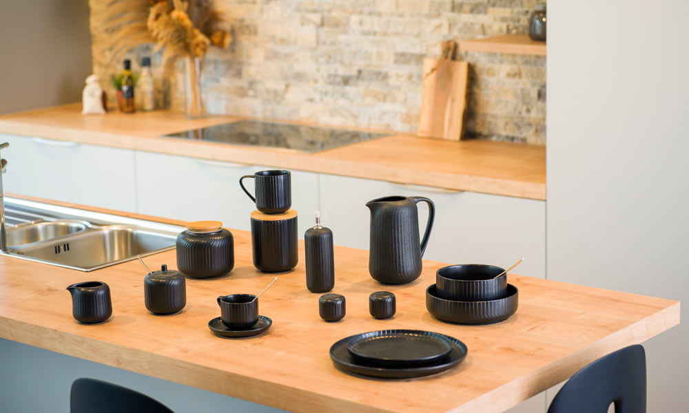 Черная посуда из керамики имеет красивую матовую отделку без глянцевого блеска. Слегка зернистая, шероховатая структура приятна на ощупь. Волнистый рельефный рисунок — еще одна отличительная черта изысканной посуды из коллекции европейского бренда. Большой ассортимент премиальной керамики в черном исполнении включает: лаконичные кувшины и молочники, кружки и чаши, тарелки и блюдца разных размеров, широкие и узкие емкости с деревянными крышками, сахарницу, бутылку для масла.