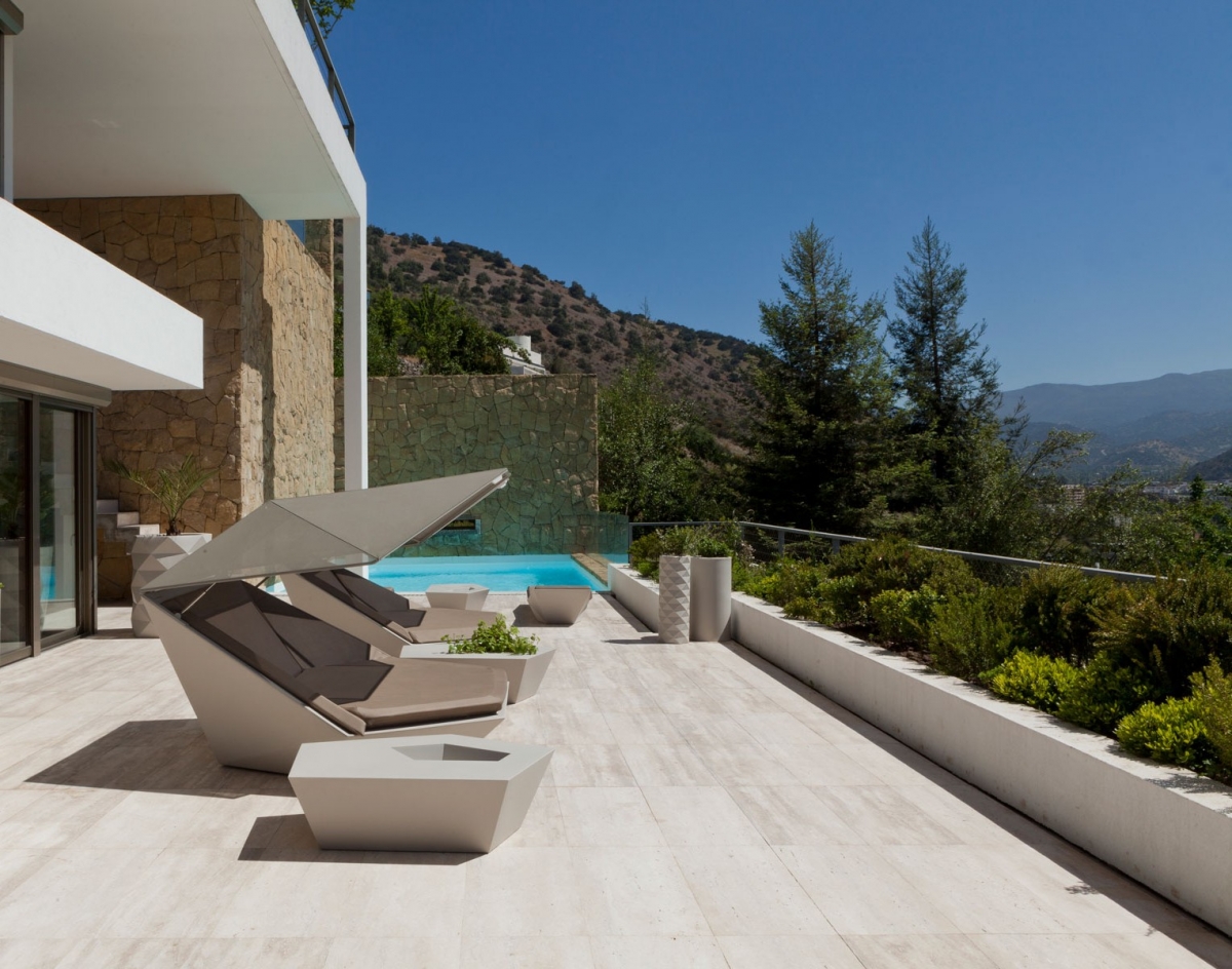 Шезлонги с навесами стали центральными элементами композиции: благодаря своим широким корпусам и замысловатой форме они выглядят не хуже, чем авангардные скульптуры. Солидные и роскошные, они задают четкий тон всему интерьеру террасы. Безукоризненно дополняют их журнальные столики из той же линейки, выполненные в виде многоугольных конструкций. Предметы удобны во время отдыха благодаря своим довольно большим столешницам и специальным выемкам в них для установки, например, стаканов с напитками. Незаменимые элементы ансамбля - белые кашпо Marquis с геометрическим декором - объединяют гарнитур с интерьером всего пространства, создавая неповторимую и целостную летнюю композицию.