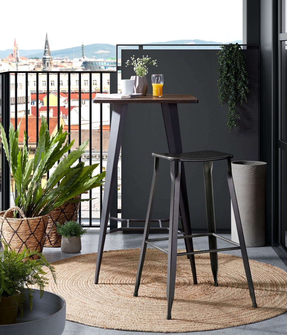 Высокий столик Malibu и барный табурет Gluke создают идеальную пару. Выверенная высота, удобное сиденье и перекладины для ног гарантируют комфорт владельца, а темные металлические ножки - чистоту и долгий срок службы предметов. Квадратная столешница позволяет расположиться за ней 1-2 людям, ее поверхность из натурального дерева придает ансамблю особую красоту. Отлично дополняют обстановку круглый напольный ковер Dip из неокрашенного джута и пара соломенных корзин, продолжающие тему эко в этом интерьере. Практичная подставка для зонтов Stefy с фактурой под бетон уравновешивает дизайн пространства, делая его целостным.