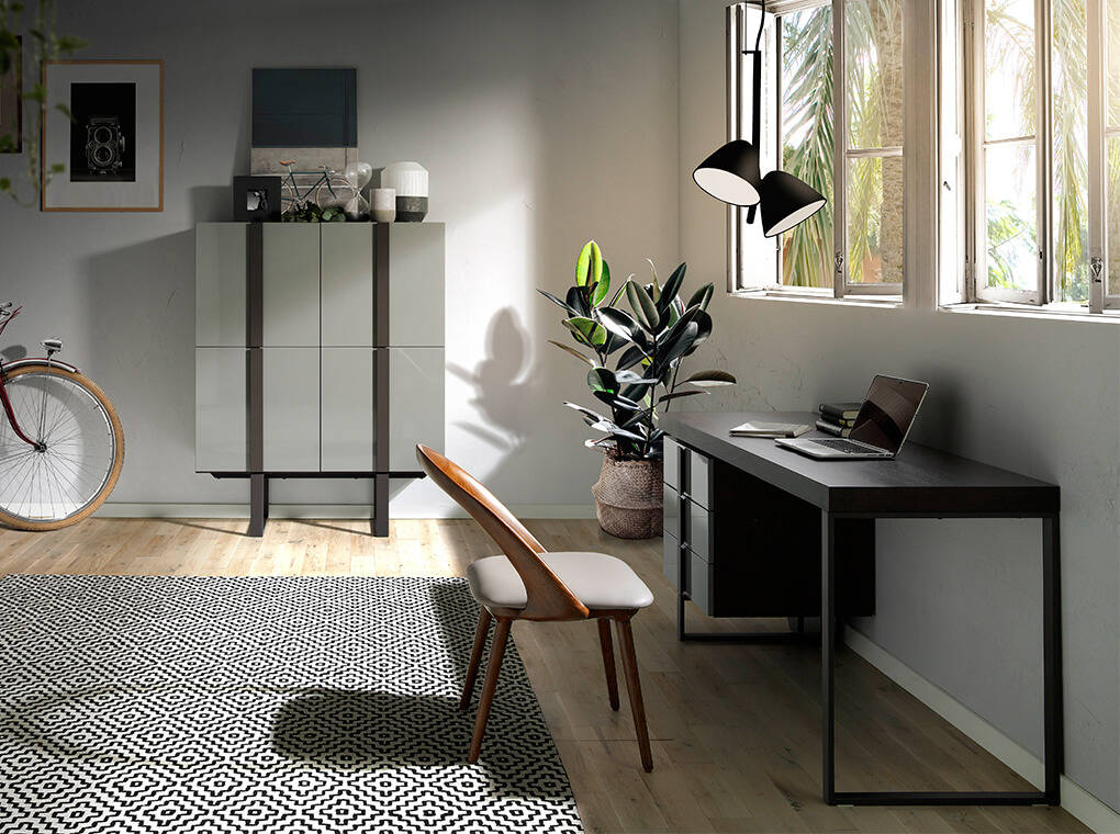 Письменный стол Urban — классика стиля хай-тек. Металл, столешница с оттенком темного венге, выдвижные ящики стального цвета с минималистской фурнитурой. Буфет Urban в той же гамме не поражает стеклянными вставками и декором — все лаконично до беспредельной строгости. Но функциональность и удобство от использования этих предметов мебели гарантированы. Освещение — максимально упрощённое, направленное, точное. Черный диодный светильник от испанского бренда с двумя алюминиевыми плафонами ничуть не выбивается из общего стилистического направления. Рабочий интерьер не отвлекает от дел и четко демонстрирует свое главное предназначение.
