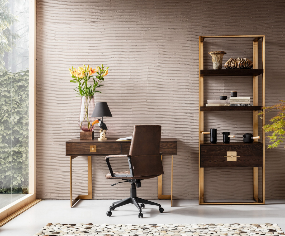 Мебельные акценты: вдоль стены расположены коричневый письменный стол Osaka с футуристическими ножками, открытый стеллаж из идентичной коллекции для сувениров, предметов быта и книг. Завершает эту историю удобное и элегантное кресло Labor с мягкими подлокотниками и на миниатюрных колесиках для мобильности.