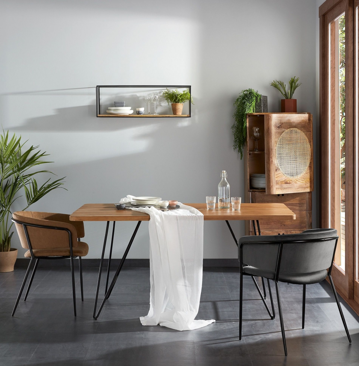Природная естественность отражена в пастельных оттенках лаконичной мебели. Это прямоугольный стол Komme с бежевой столешницей из массива тика и черными металлическими ножками, анатомические и непритязательные кресла Komme в однотонном исполнении. Центральная мебельная композиция столовой повторяет светлую цветовую гамму ретро-буфета Geraldine из массива манго. Его необычная конструкция — воплощение выразительного комфорта для этой комнаты.
