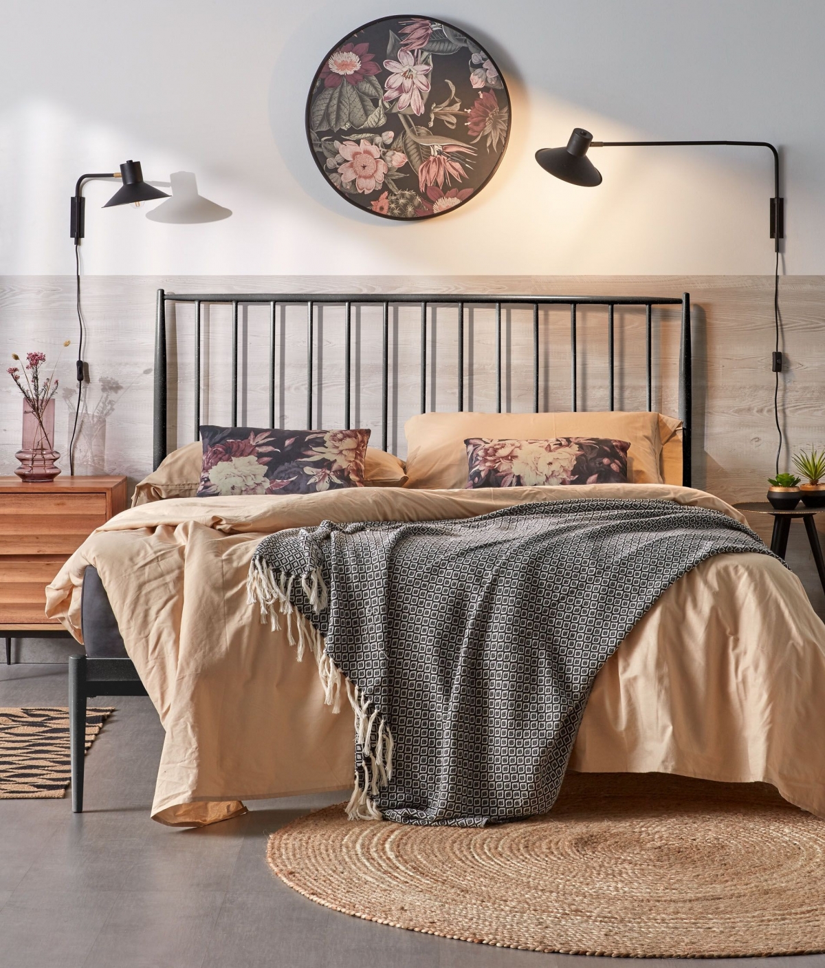 Круглый журнальный столик Pearson — изящный, на чёрных ножках. Он вновь возвращает от поэзии к прозе, но дарит функциональность этому интерьеру. Завершением общего ансамбля спальни становятся джутовые коврики Samy и Marne – классический бежевый и уникальный абстрактный.