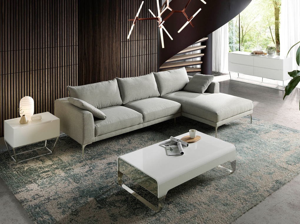 Грациозный светло-серый угловой диван с канапе занимает центральное место в обстановке. Его окружают белоснежные элементы меблировки. Это изысканный журнальный столик Atelier на серебристых хромированных ножках, прямоугольная прикроватная тумбочка в идентичном цветовом исполнении. Поодаль вольготно расположился стильный белый буфет. Он не имеет выраженной фурнитуры, но поражает четкостью линий и эргономичным исполнением четырех вместительных ящиков. Все в этом дизайне интерьера направлено на то, чтобы поразить элегантностью без элементов декора. «Облегченная» гостиная может легко преобразиться в комнату отдыха — угловая конструкция дивана позволяет утонуть в объятиях Морфея на несколько счастливых часов.
