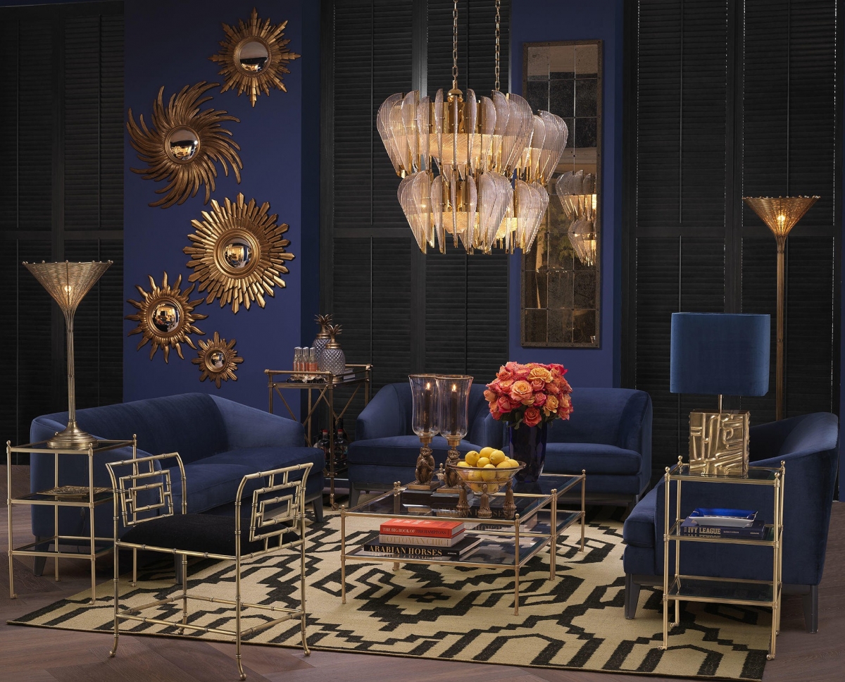 Вычурно, претенциозно, но гармонично раскрыто зеркальное оформление темно-синих стен. Это нарядные панно в виде лучистых солнечных светил в разных дизайнерских вариациях. Гостиная арт-деко — это уникальное шествие света из всех уголков комнаты. Вы можете увидеть настольные лампы Oregon с синим плафоном и резной основой, Kon Tiki в виртуозном золотом исполнении, торшер на длинной сияющей основе. Среди этого богатейшего разнообразия нельзя отрицать всю важность двух пышных люстр Canzone, свет от которых охватывают всю гостиную.