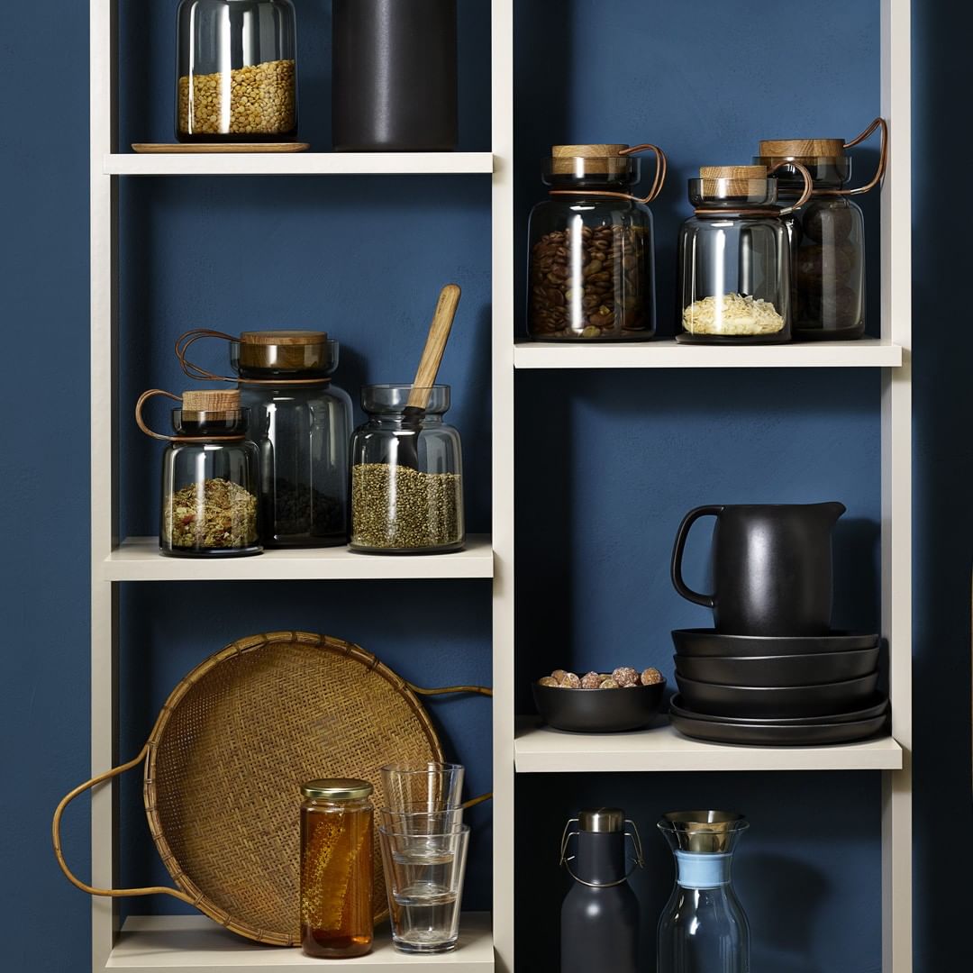 На вместительных полках стеллажа светлого дерева найдут свое место необходимые предметы. Так, банки для хранения сыпучих продуктов удобны тем, что имеют герметично прилегающие деревянные крышки. Банки прозрачны, в них видны крупы, поэтому хозяйке будет легко найти то, что потребуется.