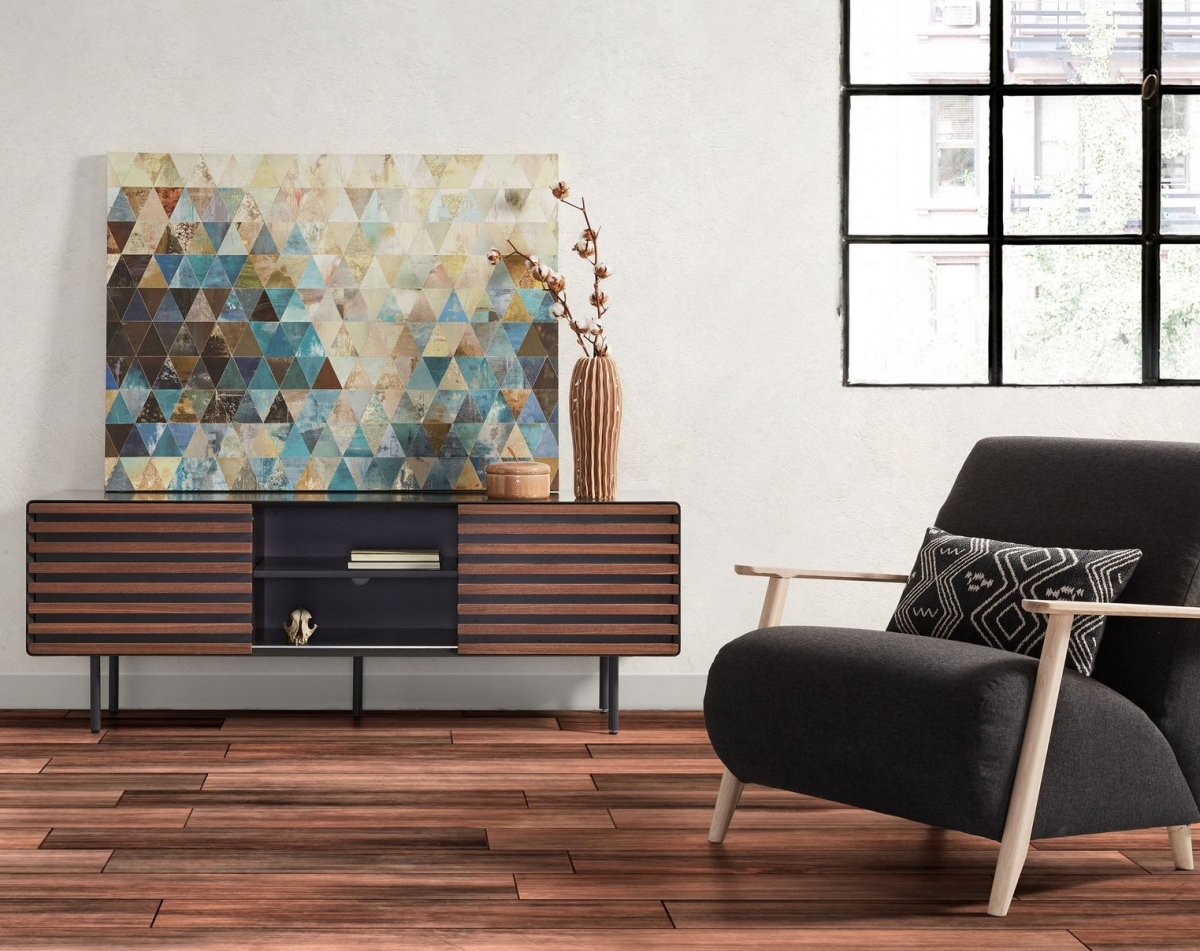 Лаконичная прямоугольная тумба Mahon функциональна: на ее полочках можно разместить много нужного, не создав беспорядка, а длинная поверхность столешницы подходит для установки ТВ. Элегантный классический декор из натурального дерева на черном гладком металле придает виду предмета строгости, одновременно делая его ярким и роскошным. Рядом с ним отлично смотрится однотонное графитово-серое кресло Marthan с каркасом из массива ясеня. Оно - мягкое, комфортабельное, отлично подходящее для самого расслабляющего отдыха. Разнообразить чопорный интерьер позволило использование картины Dou Geometrisch с сюрреалистическим абстрактным сюжетом и свежими, легкими цветовыми акцентами.