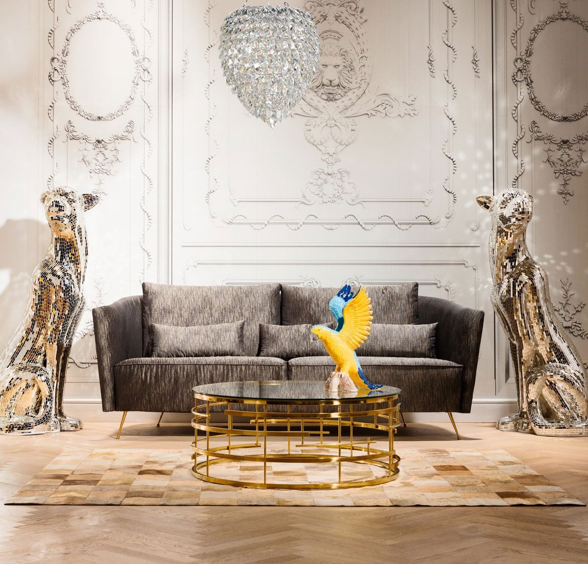 В основе мебельной концепции эстетичный серый диван на высоких, «утонченных» ножках. Реликтовым и необычным выглядит круглый журнальный столик Jupiter — истинное детище металла и стекла, чудо-планета в комнатной вселенной. Изящные декоративные пантеры — мозаичные, напольные фигуры. Словно верные стражи они лежат у ног своей прекрасной госпожи.