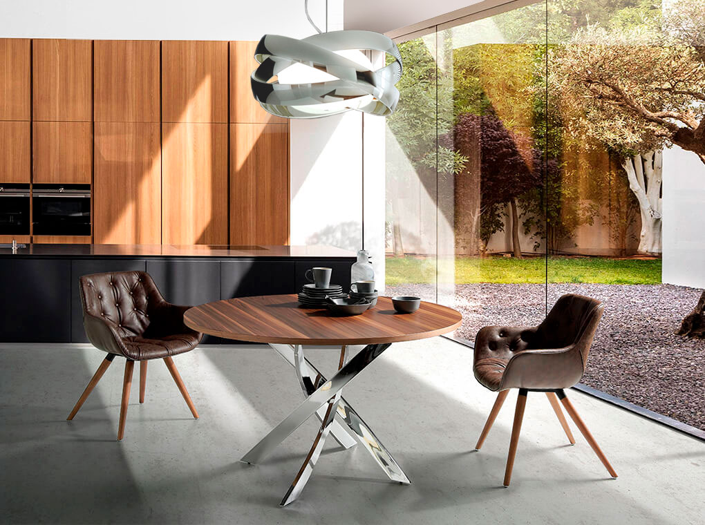 Обеденный стол из натурального массива от именитого бренда Angel Cerda со стальными переплетенными ножками радует демократичной круглой формой. К нему отлично подошли солидные кожаные стулья Fresno. Их ножки из ясеня удачно подчеркивают необычную дизайнерскую задумку.