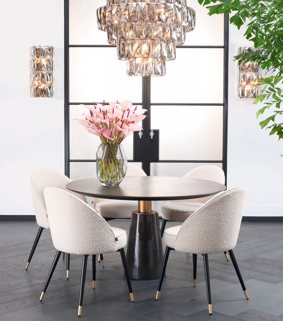 Основной акцент сделан на эксклюзивном круглом обеденном столе Genova. Его шоколадная цветовая палитра и эстетичная ножка под мрамор заявляют о солидности интерьера. В пару к столу добавлены металлические стулья Cooper с черно-золотистыми ножками и мягкой комфортной обивкой.