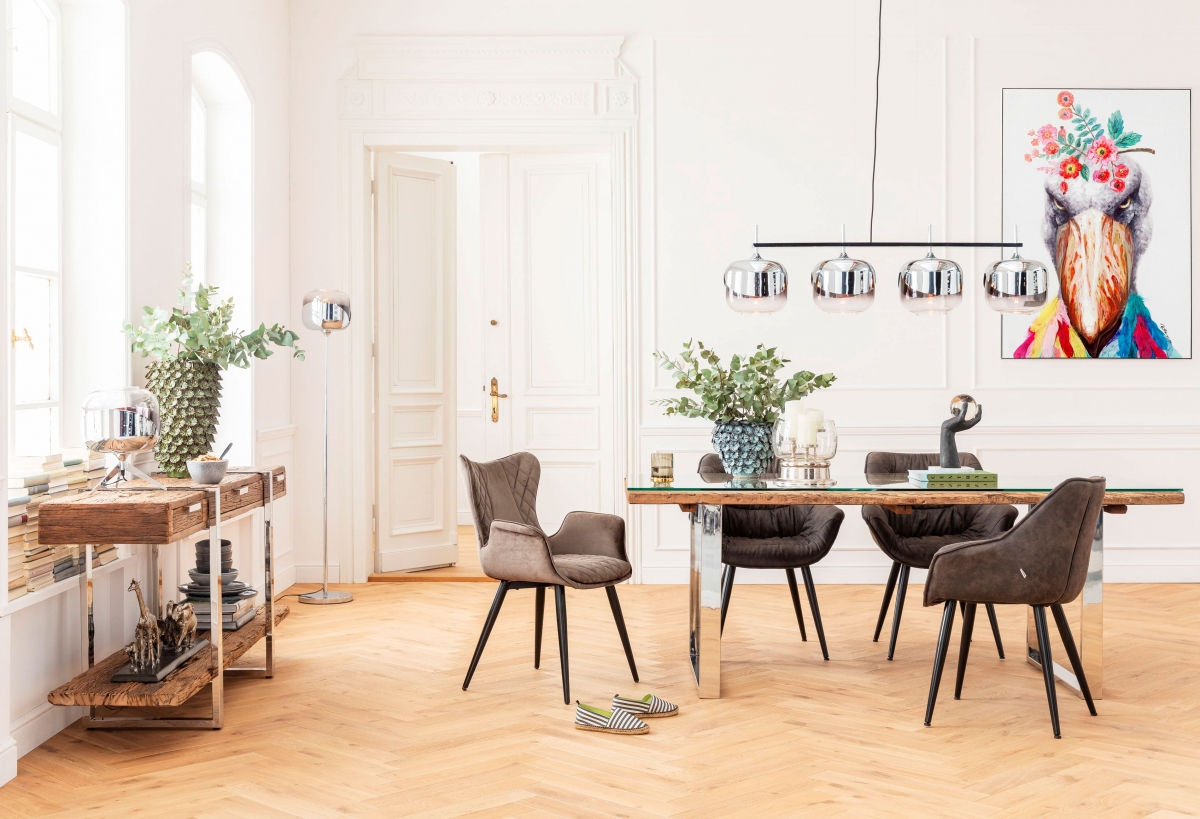 В центре внимания прямоугольный лаконичный стол Rustico, которые может порадовать своим непритязательным и скромным дизайном. Он окружен металлическими стульями Thelma и Dream с удобными подлокотниками, в темно-сером и нежно-шоколадном цветовом оформлении. Функциональная древесно-металлическая консоль Rustico легко вмещает посуду и предметы декора. Она гармонично вписывается в авангардную столовую без лишних изысков.
