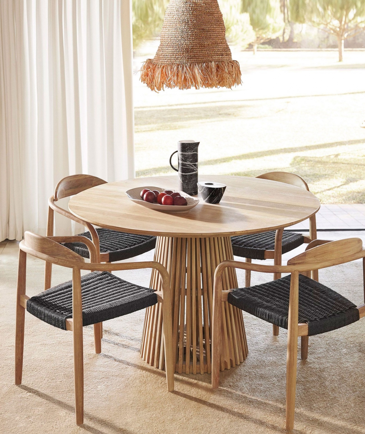 Круглый кухонный стол Jeanette из тика — природное воплощение в чистом виде. Его натуралистичность колоритно дополняют комфортные стулья Glynis из массива эвкалипта с серой текстильной обивкой. Керамическая ваза Сrazy в форм-факторе эстетичного кувшина отделана под мрамор и облагораживает общую интерьерную концепцию.