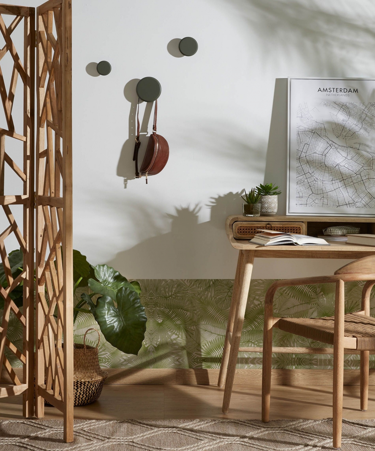 Письменный стол Nalu из натурального массива минди — отражение любви к природной фактуре и натуралистическим краскам. К нему идеально подходит бежевый стул Glynis из эвкалипта с текстильным сиденьем. Древесную концепцию поддерживает и большая ширма Austy из тика — ажурная, светлая, богемная. Лаконичные настенные вешалки Nadua круглой формы делают акцент на однотонной стене. Тёмный окрас этого элемента меблировки легко и непринужденно контрастирует с общей гаммой комнаты. Остается лишь приспособить каждый предмет для решения определенной задачи и наслаждаться подаренным уютом.