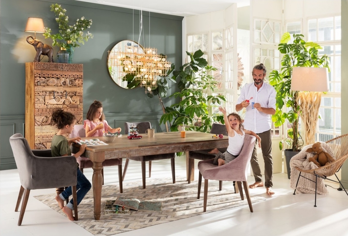 Прямоугольный стол с резными ножками окружают стильные, современные стулья Mode в графитовых и нежно-розовых оттенках, с удобными подлокотниками и без. Их деревянные устойчивые ножки уместны в комбинации с мягкой обивкой. Эко-стиль в бежевых, натуральных тонах отражает округлое кресло Spaghetti на контрастных металлических ножках. Фантазийный винтажный шкаф Shanti Surprise похож на сказочный дворец, украшенный барельефами.