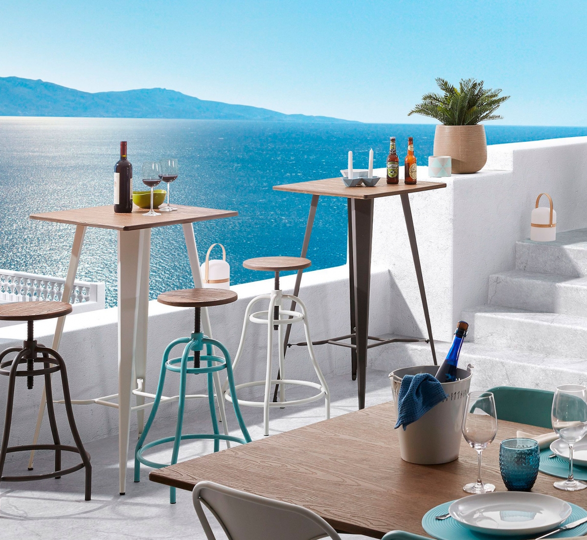 Эксклюзивный мебельный комплект во французском стиле удачно включает лаконичные прямоугольный столик Malibu с причудливыми ножками черного цвета и барные столики той же коллекции. Металлические стулья с регулировкой высоты легко дополняют основной предмет мебели. Для любого небольшого кафе в европейском стиле этот дизайн станет настоящей находкой. Уличное оформление подчеркнуто свежестью зелени, бирюзовыми мягкими подушечками для посетителей этого замечательного места.