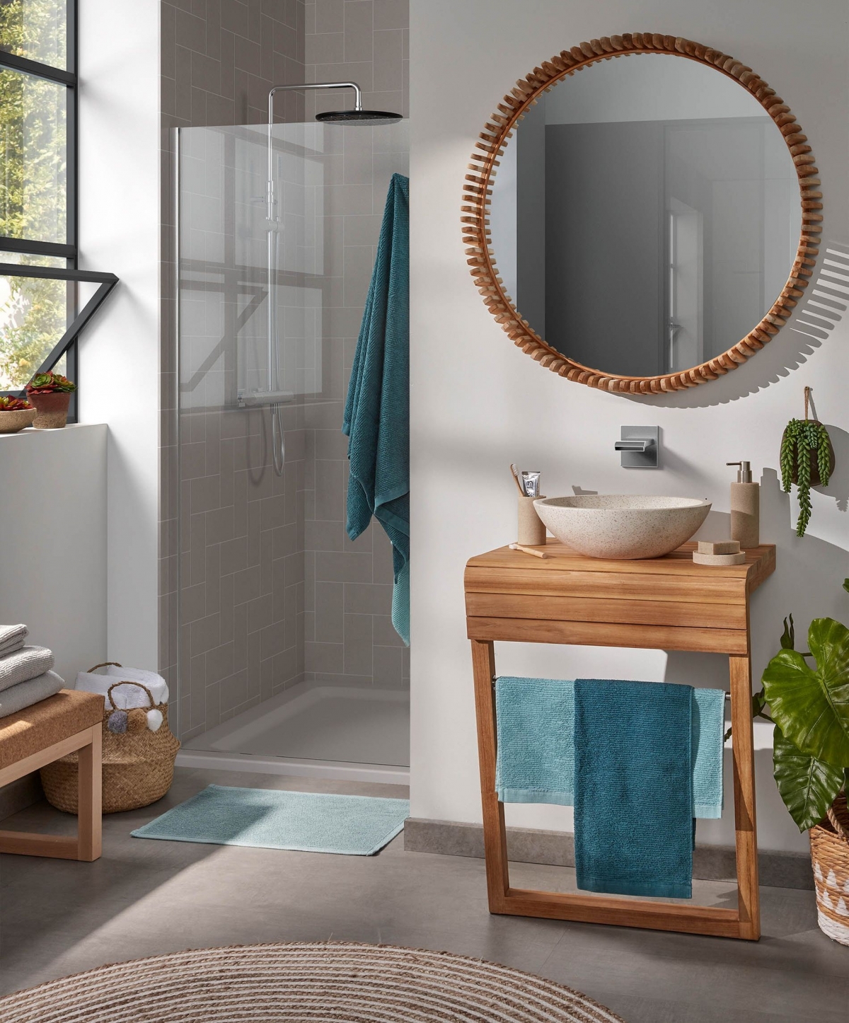 Керамическая бежевая раковина Sunday достойно смотрится на консоли из тика. Древесную концепцию продолжает удлиненная банкетка Yola с горчичным чехлом. Он удачно стилизован под пробковое дерево. Зеркало на стене в круглой, солидной раме из тика дарит особенный колорит помещению.