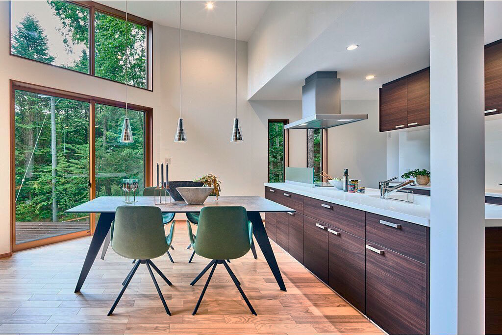 В центре внимания дизайнерский стол прямоугольной формы с плоскими металлическими ножками черного цвета. Его столешница из керамики выглядит привлекательно и стильно. Комфортные металлические интерьерные стулья с подлокотниками Yasmin в приглушенном зеленом цветовом исполнении обиты синтетической кожей. Но от этого общая атмосфера кухонного уюта не утрачивается, а обретает новые, удивительные черты. Миниатюрные светильники удачно гармонируют со стальной фурнитурой изысканного и строгого гарнитура.