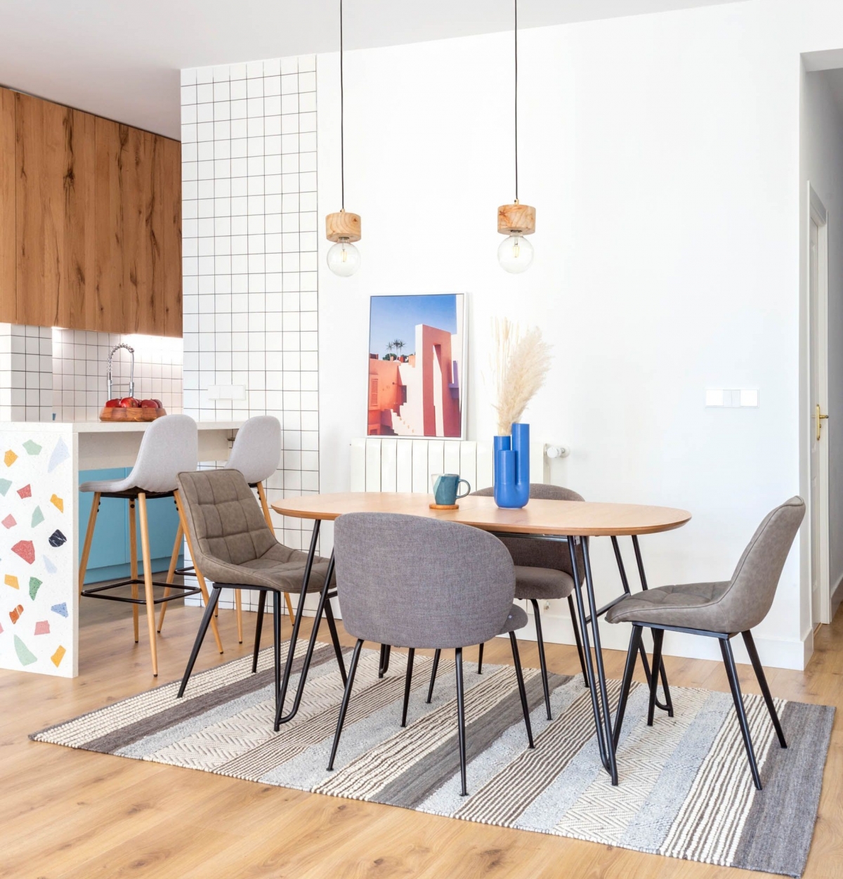 Обеденный стол Novac в приятной овальной форме на металлических черных ножках имеет раскладную конструкцию для максимального удобства. Столешница выполнена из МДФ и покрыта шпоном натурального дубового цвета. Солидный серо-бежевый стул от испанского бренда Adah — отличный компаньон других предметов меблировки в этой уютной столовой. Обивка из искусственной кожи, стеганый чехол, выразительная фактура и стальные ножки — чёткие геометрические формы делают стул уникальным. Еще одна удобная модель для посиделок стул Minna. Светло-серая гамма и милая обивка гармонично сочетаются с надежным стальным каркасом. Барную тематику полностью раскрывает высокий стул Nilson в идентичной цветовой гамме.