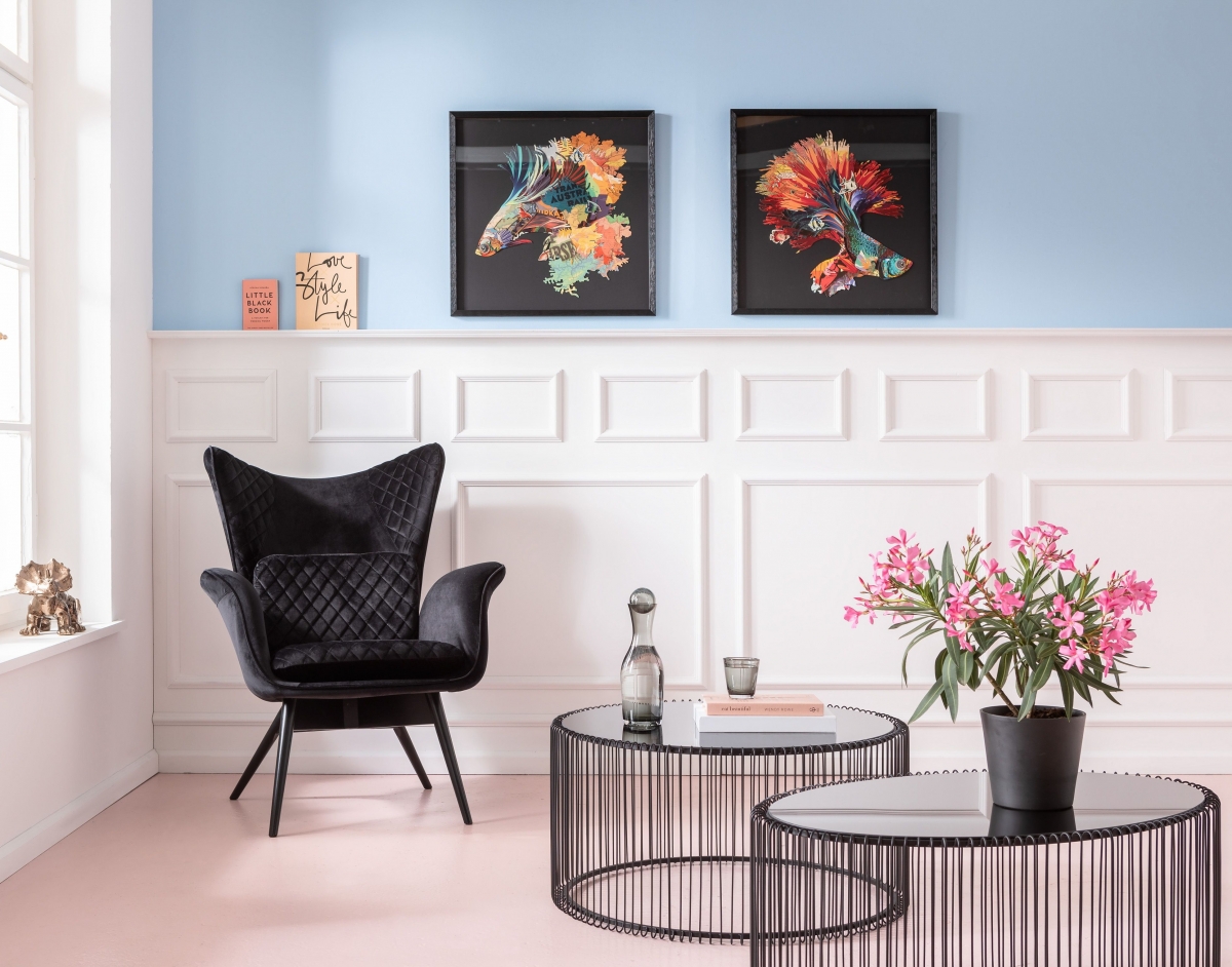 Бархатное дизайнерское кресло Tudor - центральный элемент композиции, настоящее произведение интерьерного искусства, способное своим обликом преобразить всю комнату. Утонченная изогнутая форма деталей, манящий блеск бархата, солидная отстрочка ткани ромбами и глубина чистого чёрного цвета - вот то, что приковывает к нему взгляд и вызывает восхищение. Роскошный предмет наполняет обстановку вокруг ощущением презентабельности и комфорта. Отличным дополнением к нему выступают современные воздушные столики Wire - они также черные, эффектные, но лаконичные и строгие. Не перегружая интерьер деталями, они все же подчеркивают его элитарность и дарят удобство владельцу. Пара коллажей Fish на стене делает композицию законченной, одновременно внося в нее нотки новизны и свежести.