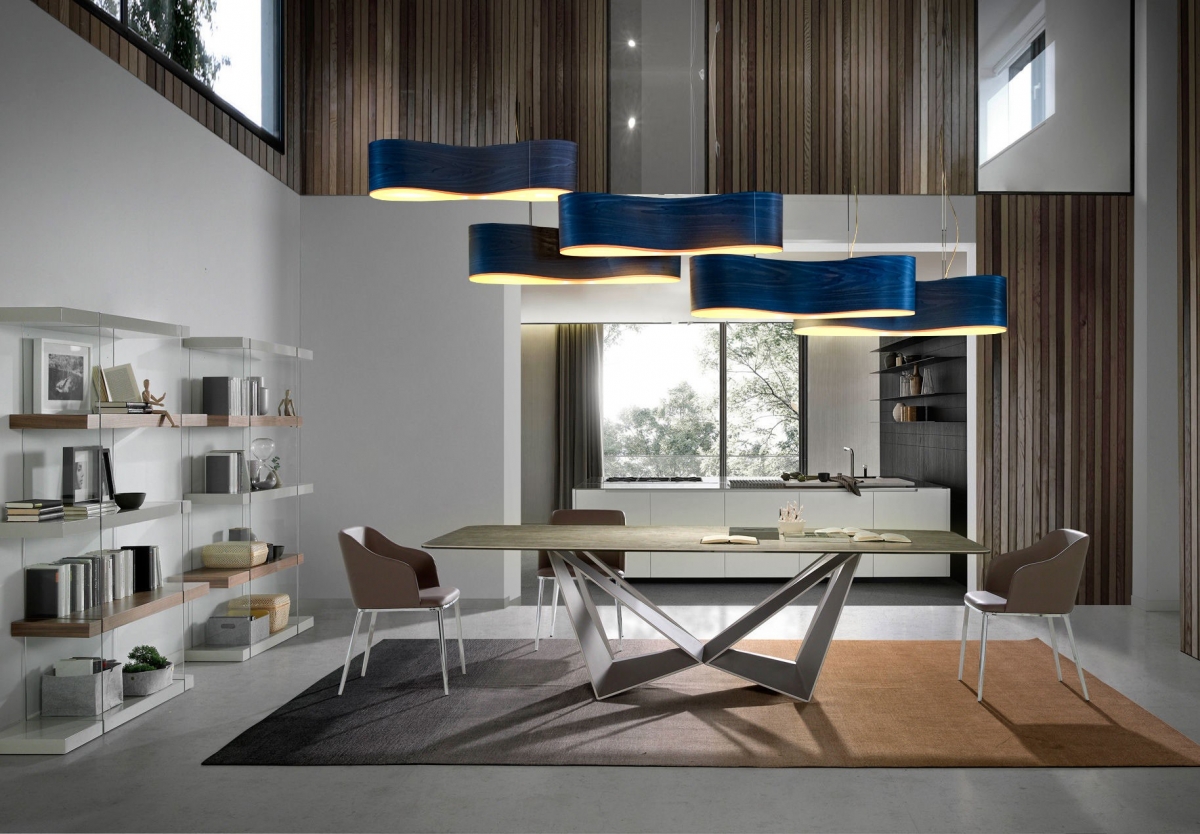 Дизайнерские стол и стулья, оснащенные светлыми тонкими ножками, будто “парят” в воздухе, создавая иллюзию свободы и пустоты в пространстве. Матовые верхние части предметов окрашены в нейтральные оттенки, создающие в комнате атмосферу покоя. Необычная по форме опора обеденного стола придает интерьеру сюрреалистический колорит, который проявляется еще более явно в дизайне подвесных светильников. Насыщенно-синие изогнутые плафоны являются настоящим украшением этой композиции - их стильный и яркий облик и неожиданный цвет будят воображение и радуют взор.