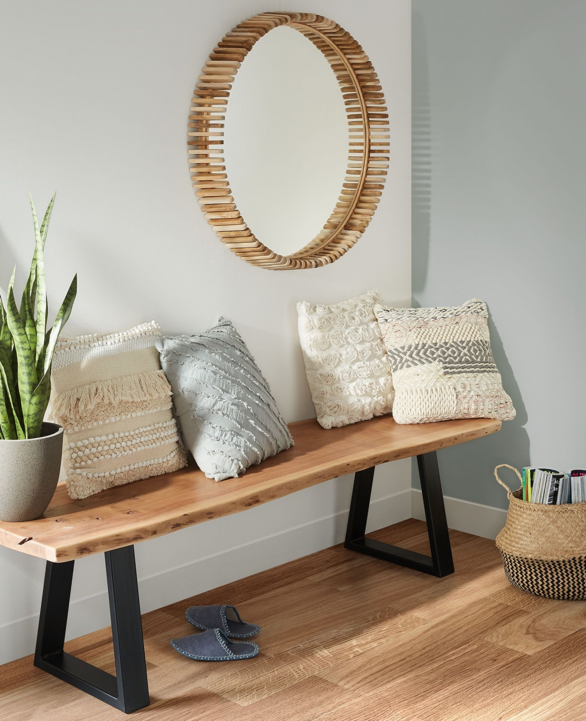 Широкая и устойчивая скамья Sono благодаря своей простой форме легко поместится даже в самом укромном уголке жилища, позволив использовать его площадь по максимуму. Сиденье из цельного отполированного массива сосны и необычные треугольные ножки придают предмету стиля, делают дорогим и модным на вид. Свободную стену над скамьей украсили круглым зеркалом Polke, оформленным в оригинальную раму из массива тика. Необычный предмет выглядит роскошно, внося в традиционный интерьер современные свежие нотки. Пара стильных объемных корзин Sofly из неокрашенной соломки добавляет в атмосферу помещения уюта и тепла, одновременно позволяя удобно складывать все, что нужно каждый день.