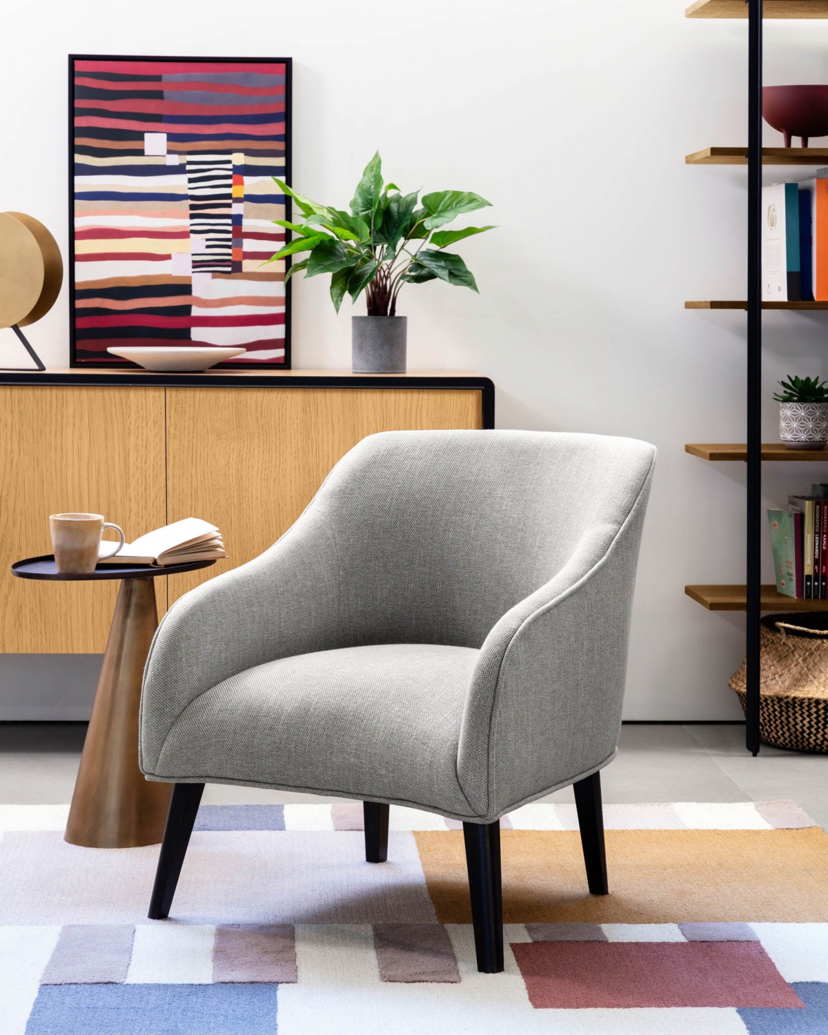 В центре внимания уютное светло-серое кресло Lobby с мягкой текстильной обивкой на черных ровных ножках. К нему подобострастно примыкает эстетичный журнальный столик Liliane с конусообразной золотой ножкой. Немного поодаль гармонично размещается стеллаж Nadyria с основой из черного перфорированного металла и полками из натуральной древесины.