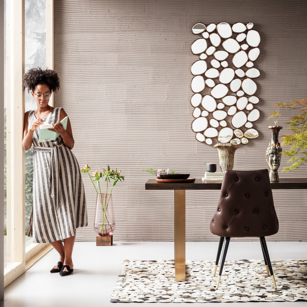 Центром композиции является стол на массивных металлических опорах, намекающий на рациональность урбанистического стиля. Но его столешница из ясеня создает приятный контраст и вызывает ощущение близости к естественной красоте. Внимание сразу переключается на роскошное зеркальное панно, имитирующее отполированные до блеска камни горного ручья и словно отражающее прохладный рисунок необычного кожаного ковра. Хочется тут же присесть на мягкий и уютный кожаный стул, чтобы предаться фантазиям или погрузиться в чтение любимой книги.