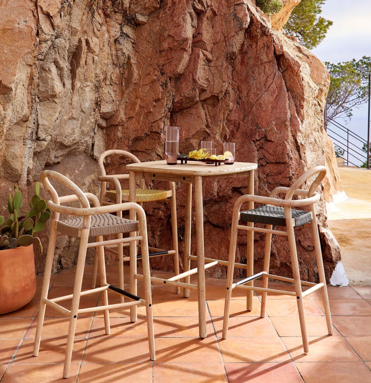 Все элементы меблировки выполнены из натурального эвкалипта светлого, естественного оттенка. Это лаконичный и строгий, высокий барный стол, три идентичных стула. Последние могут похвастаться эстетичным текстильным дополнением в золотистом, черном и бежевом оттенках. Ничего лишнего — только деревянная мебель для максимального комфорта. Этому интерьеру лаунж-зоны чужды вычурность, яркость красок, разнообразие форм и сочетание стилей. С оформлением все предельно просто и понятно, но от этого оно не становится менее привлекательным.