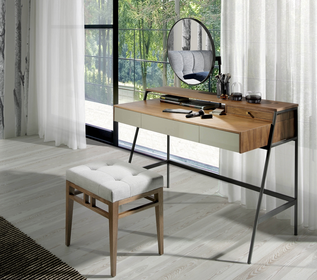 Стильный столик для туалетных принадлежностей Nature Life от известного бренда Angel Cerda — универсальный вариант, который легко вписывается в любую обстановку. Он выполнен из натурального дерева. Столешницу удерживают металлические ножки, а ее вместительные ящички непринужденно скрывают женские «штучки» от посторонних глаз. Не забыли создатели и о круглом зеркальце — кокетливом и эргономичном.