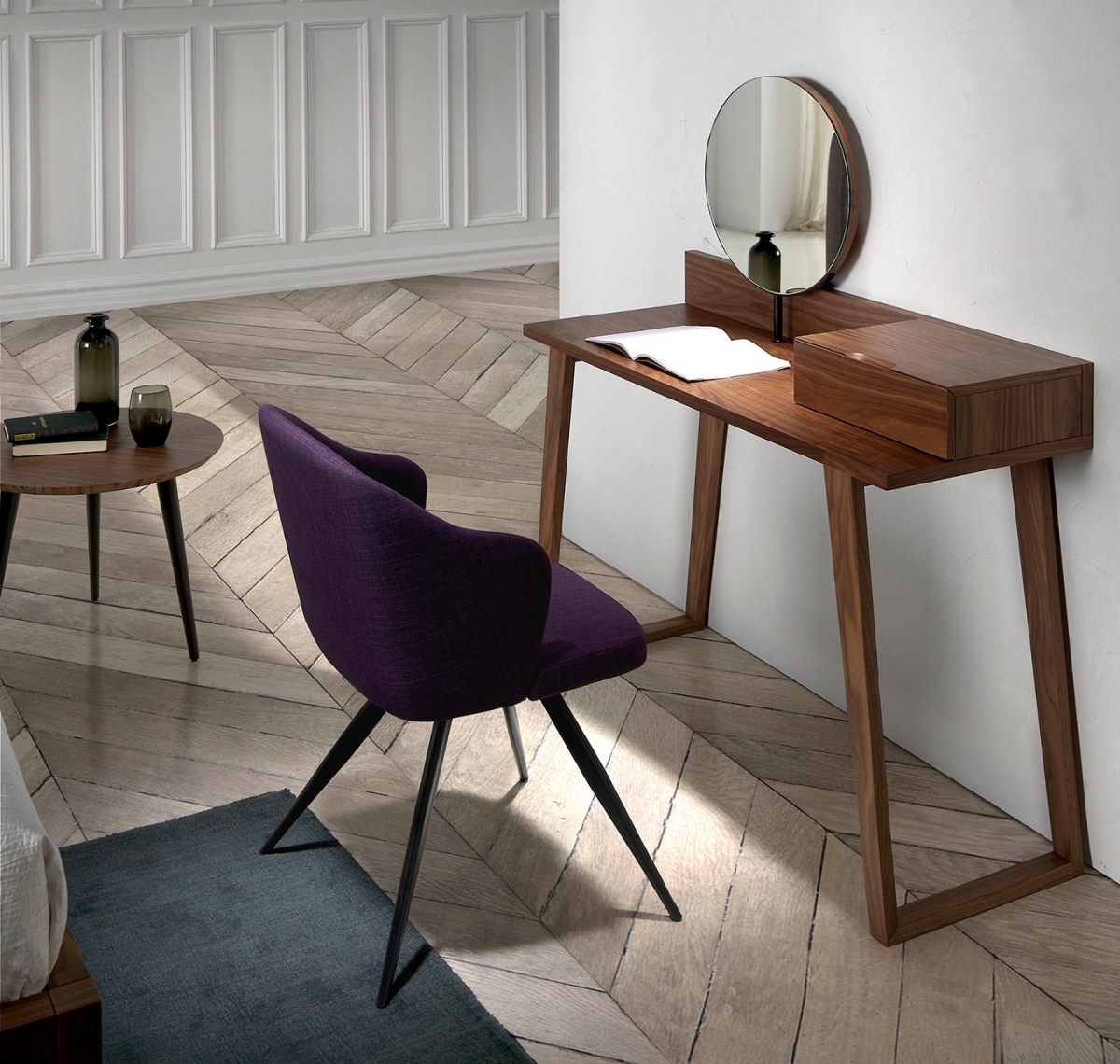 Туалетный столик с зеркалом от европейского бренда способен украсить комнату привлекательным натуральным оттенком шпона грецкого ореха. На нем прекрасно размещаются все необходимые средства по уходу. Компактный столик из качественных материалов — элегантное решение в эко-стиле. При необходимости его можно разместить в другом месте, немного сдвинуть для создания эксклюзивного дизайна интерьера.