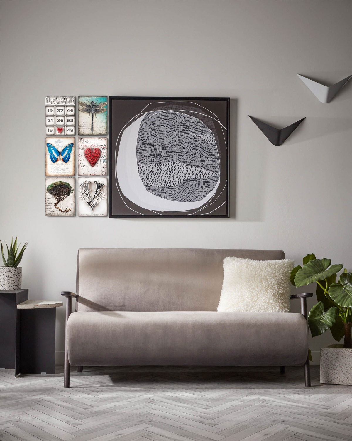 Эксклюзивно оформлена стена. Квадратный постер с абстрактным изображением в оттенках серого перекликается с цветом дивана. На стене закреплены 6 декоративных плиток с символическими разноцветными и объёмными изображениями. Справа от постера – идеально расположены оригинальные бра белого и черного цвета, по форме напоминающие летящих чаек.
