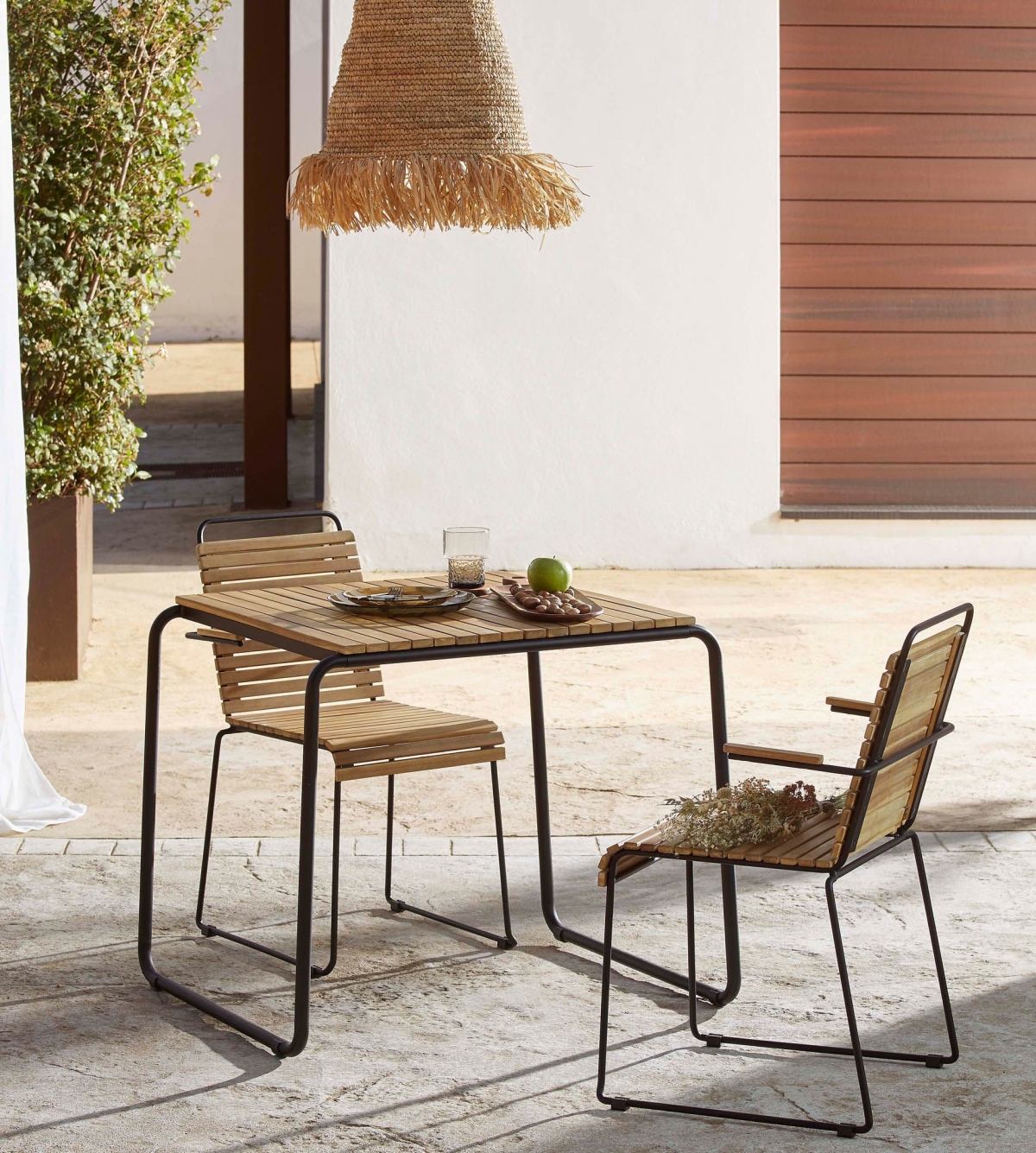Минимум мебельных элементов — это приятно, скромно и гармонично. В основе оформления прямоугольный небольшой столик Yukari, благодушно «примиряющий» деревянный верх с чёрной металлической основой. Штабелируемые стулья в древесной цветовой палитре принадлежат к той же коллекции. Они немного напоминают укороченные шезлонги. Поэтому данную мебельную группу легко представить где-то на вилле вблизи океанического побережья. Милый и функциональный подвесной светильник Shianne с соломенным абажуром легко придаст интерьеру нотку загадочности.
