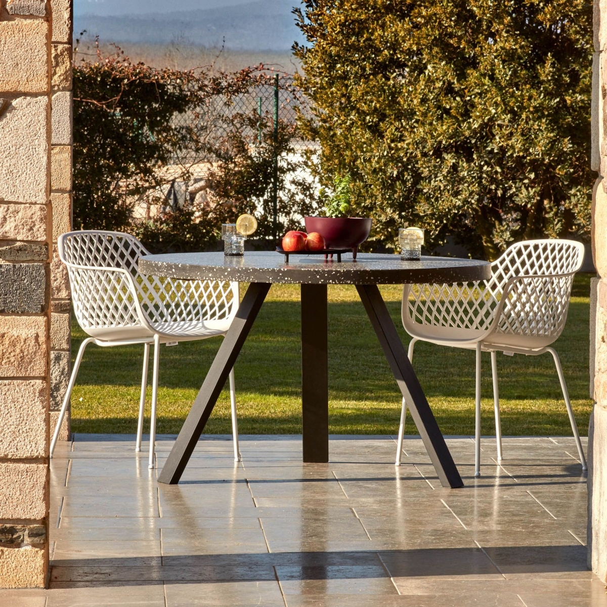 Вдали от дела так легко поддаться искушению и устроить чаепитие на фоне живописного пейзажа. К этому располагает фактурный керамический стол круглой формы с чёрными металлическими ножками классического образца. Около него с комфортом размещаются эстетичные белоснежные стулья Quinn на стальном каркасе. Плетеная спинка немного разбавляет общую дизайнерскую концепцию, привносит легкость и изящество в этот традиционный, солидный, строгий интерьер. Нужно только устроиться поудобнее и наблюдать за преображением природных явлений, удивительными закатами и восходами, лениво потягивая коктейль, освежающий мохито, свежевыжатый сок.