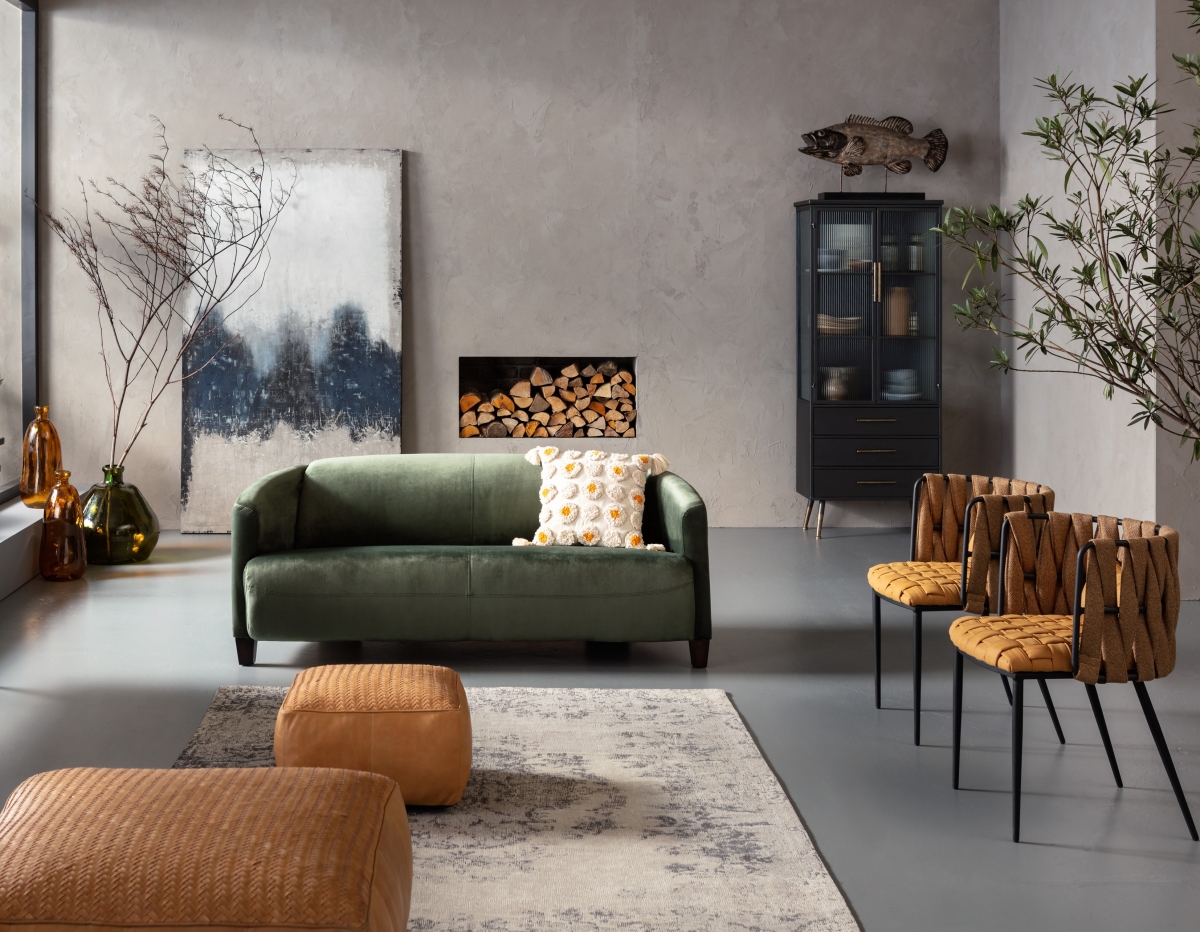 Необходимую практичность интерьеру придает шкаф-витрина La Gomera насыщенного и загадочного синевато-серого цвета. За его матовыми полупрозрачными дверцами можно разместить все нужные мелочи. Атмосферу уюта и теплоты в помещении создает прямоугольный бежевый ковер из натурального хлопка Kelim Pop. Его благородный орнамент, мягкая фактура и уникальный дизайн “под старину” навевают размышления и будят ностальгию.