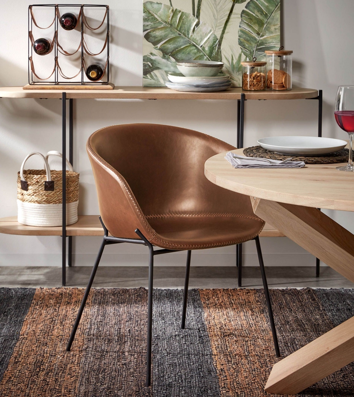 Комфортабельный и широкий кожаный стул Yvette вместе с выразительным и фактурным напольным ковром Like “отвечают” за презентабельность помещения. Эти предметы из благородного материала “под кожу” выглядят изысканно, дорого, солидно, а заодно и оживляют интерьер своим теплым шоколадным оттенком. Для удобства пользования обеденной группой дизайнерами предусмотрено ее оснащение полезными аксессуарами. Это - элегантный винный стеллаж Winnoe и 3 соломенных корзины Kubica для хранения любых нужных предметов.