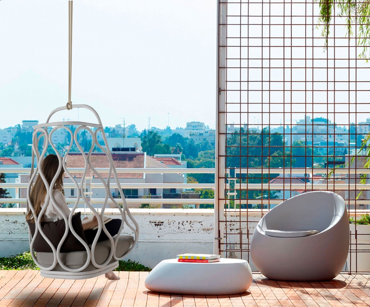 Главный и притягивающий к себе взгляд элемент композиции - подвесное кресло из ротанга Nautica. Его широкое округлое сиденье и воздушная конструкция, легко парящая в воздухе, подарят сидящему незабываемые безмятежность и комфорт.Спинка из причудливо изогнутых прутьев смотрится просто и, в то же время, диковинно, словно деталь экзотической мебели незнакомых народов. Органично рядом с подвесной конструкцией смотрятся столик и кресло от Vondom серии Stones. Их гладкие поверхности и лаконичные формы уравновешивают ее диковинный облик, освежая интерьер, наполняя его свободой и простором. При всей своей нестандартности предметы вполне функциональны: у кресла есть просторная и удобная ниша для сидения, а аккуратный столик имеет прямую и гладкую столешницу для складирования мелочей.