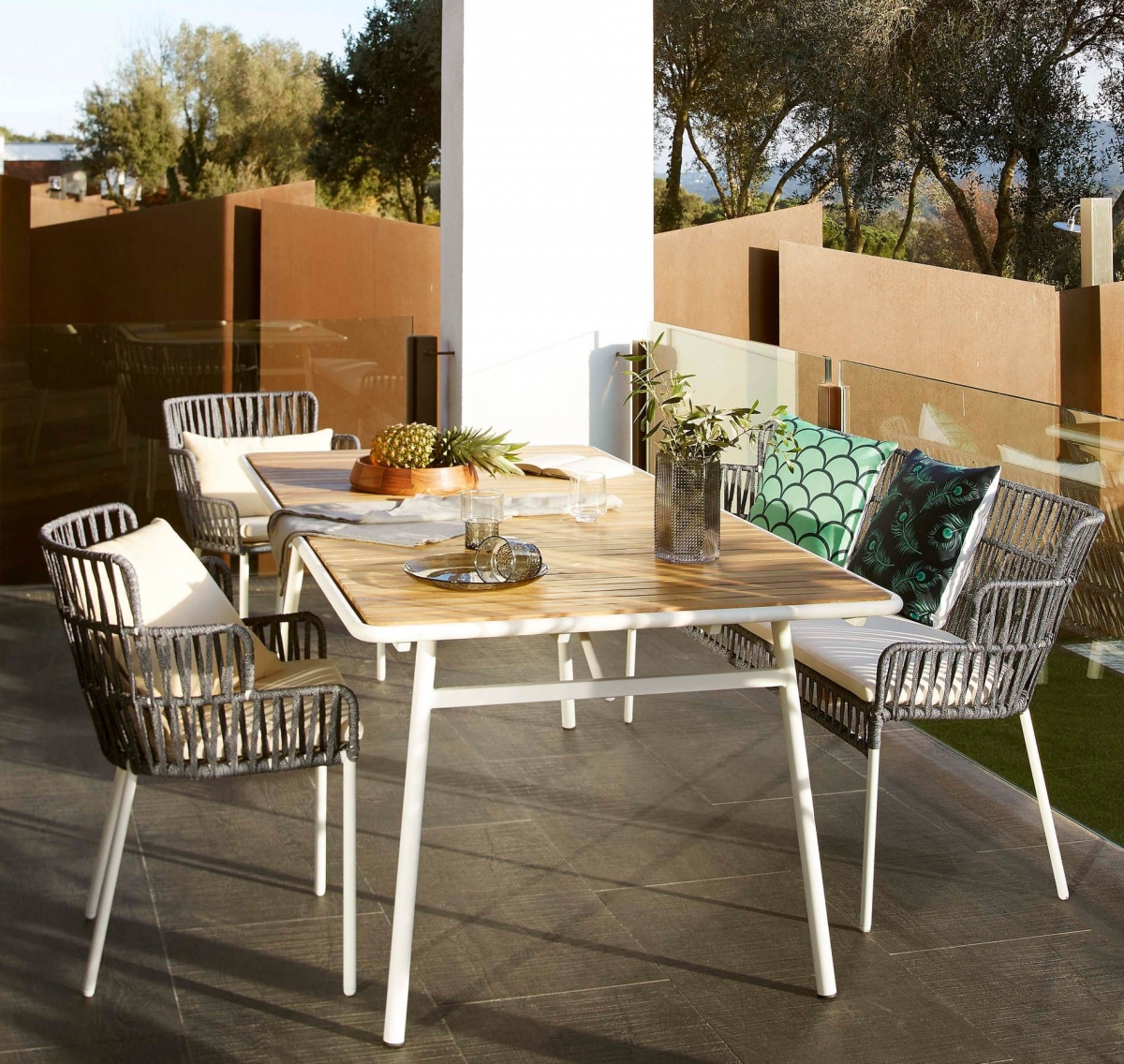 Для создания интерьера на террасе были выбраны стулья и диван из коллекции Robyn. Это плетеная садовая мебель, которая изготовлена из очень прочных, устойчивых к растяжению материалов. Чтобы было удобно сидеть, на основание стульев и дивана кладутся специальные невысокие подушки. В данной композиции акцент сделан на темные цвета, что делает ее более строгой и собранной.