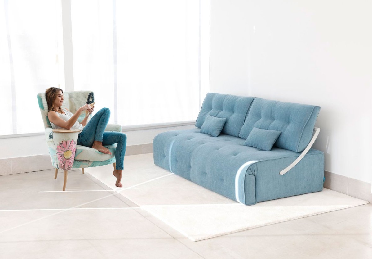 В основе дизайнерского оформления интерьера нежные светлые оттенки и удобная мягкая мебель. Эстетичный диван Indy в бирюзовом исполнении легко превращается в комфортабельную кровать. Так что эту комнату можно легко приспособить и под спальню при необходимости. Дуэтом для дивана служит эффектное кресло Christie на аккуратных ножках из светлого дерева. Они удачно гармонируют с идентичной встроенной столешницей. Мягкая обивка этого акцентного предмета мебели пестрит приглушенными, умеренно яркими красками, вносит элемент творчества в общий интерьер и его оформление. Уютная мини-подушка для кресла делает его еще наряднее и эстетичнее.