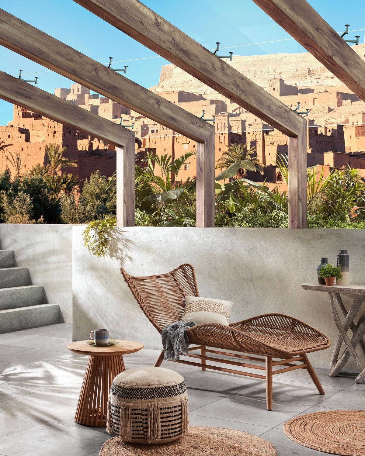 Кофейный столик Jeanette составляет приятную пару шезлонгу из эвкалипта. Он выполнен в светлой цветовой палитре из тикового дерева. Миниатюрный предмет мебели с круглой столешницей выглядит изящно и нетрадиционно. Очаровательным, разноцветным ковриком Samy из натурального джута укрыты полы на этой террасе. Эффектный акцентный элемент радует взгляд своей палитрой. Несколько ярких оттенков, сливаются воедино, чтобы напомнить об особенной гармонии, которой можно достичь только в процессе настоящей, безграничной релаксации.
