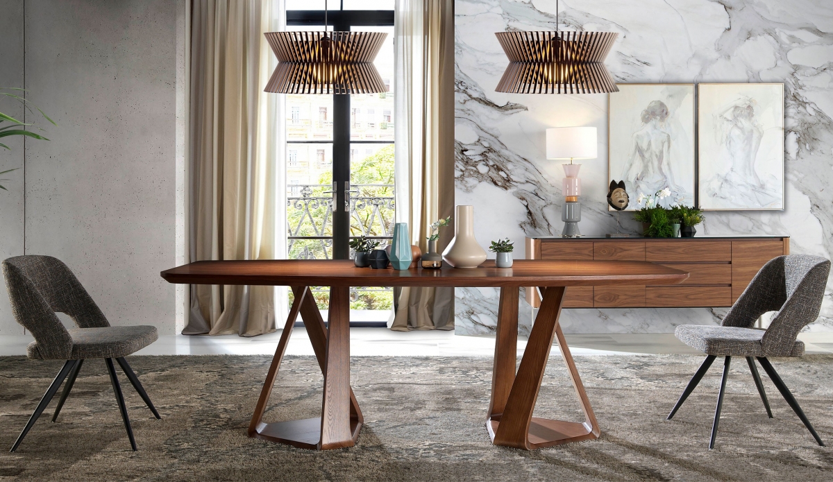 Фактурный стол из покрытого шпоном грецкого ореха от бренда Angel Cerda поражает необычными фигурными опорами в натуральной древесной палитре. Органичным является его соседство с серыми мягкими стульями на чёрных металлических ножках. Прочные и стильные конструкции — практичное решение для вашей гостиной. Вдохновляющий постер Mystery в черно-белом исполнении подчеркивает строгость и эклектичность дизайна.