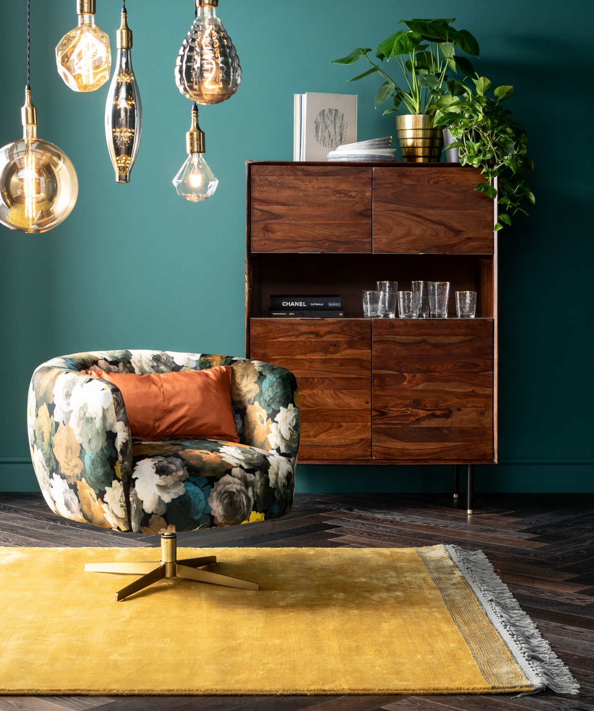 На этот раз наши дизайнеры решили поэкспериментировать с простыми строгими линиями и оригинальными формами. Основа интерьера — стабильность, отраженная сухим прямоугольником барного шкафа Ravello, и немного смягченная легкостью вискозного ковра. Изюминка обстановки — небольшое кресло с цветочным орнаментом, которое не просто привлекает к себе внимание, но затягивает в свои уютные сети картинкой идеального отдыха и полного расслабления. Оригинальной формы лампочки — акценты, превращающие комнату в место со своим уникальным характером.