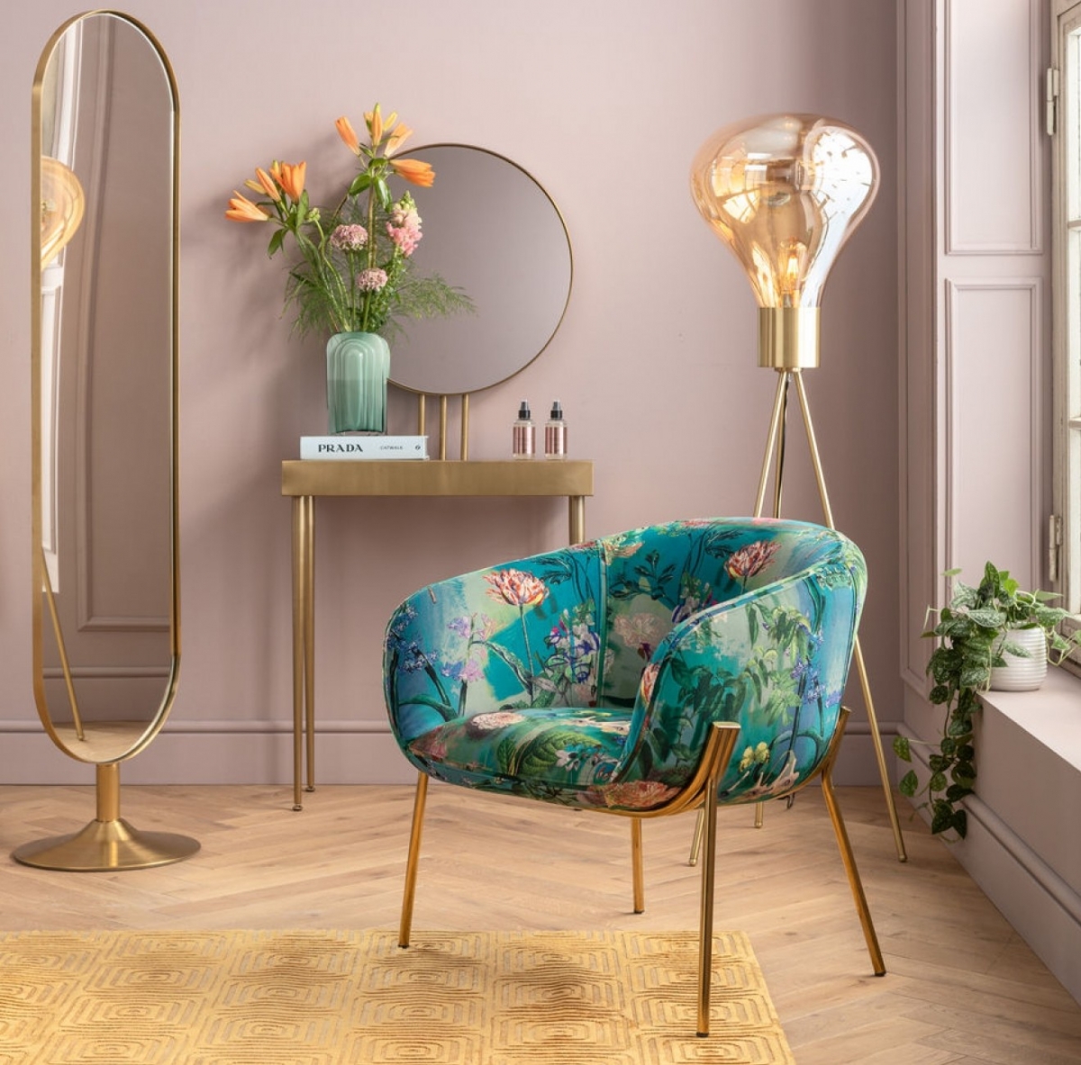 Выразительное, габаритное и удобное кресло Paradise на глазах «расцветает» бирюзовыми и розовыми красками насыщенного флористического принта. Золотые ножки еще раз подчеркивают гламурность интерьера. Металлическая консоль Art — истинное произведение искусства. Ненавязчивый блеск матового золота, удобно расположенное круглое зеркало, изысканность стиля арт-деко в этом элементе меблировки не прекращают поражать наше воображение.