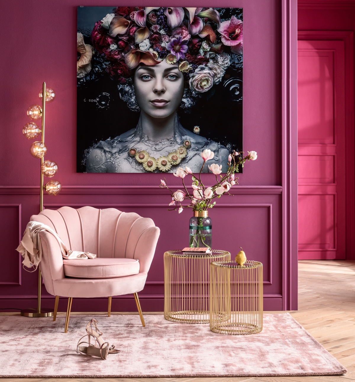 Потрясающими красками и изысканной флористикой ослепляет большой постер Flower Art Lady на стекле. Это яркое пятно, настоящий акцентный декоративный элемент, который дарит отличное настроение и подчеркивает эмоциональность владелицы дома или квартиры. На полу заметен нежно-розовый вискозный коврик с градиентными переходами, торжественно поддерживающий концепцию самой женской цветовой палитры.