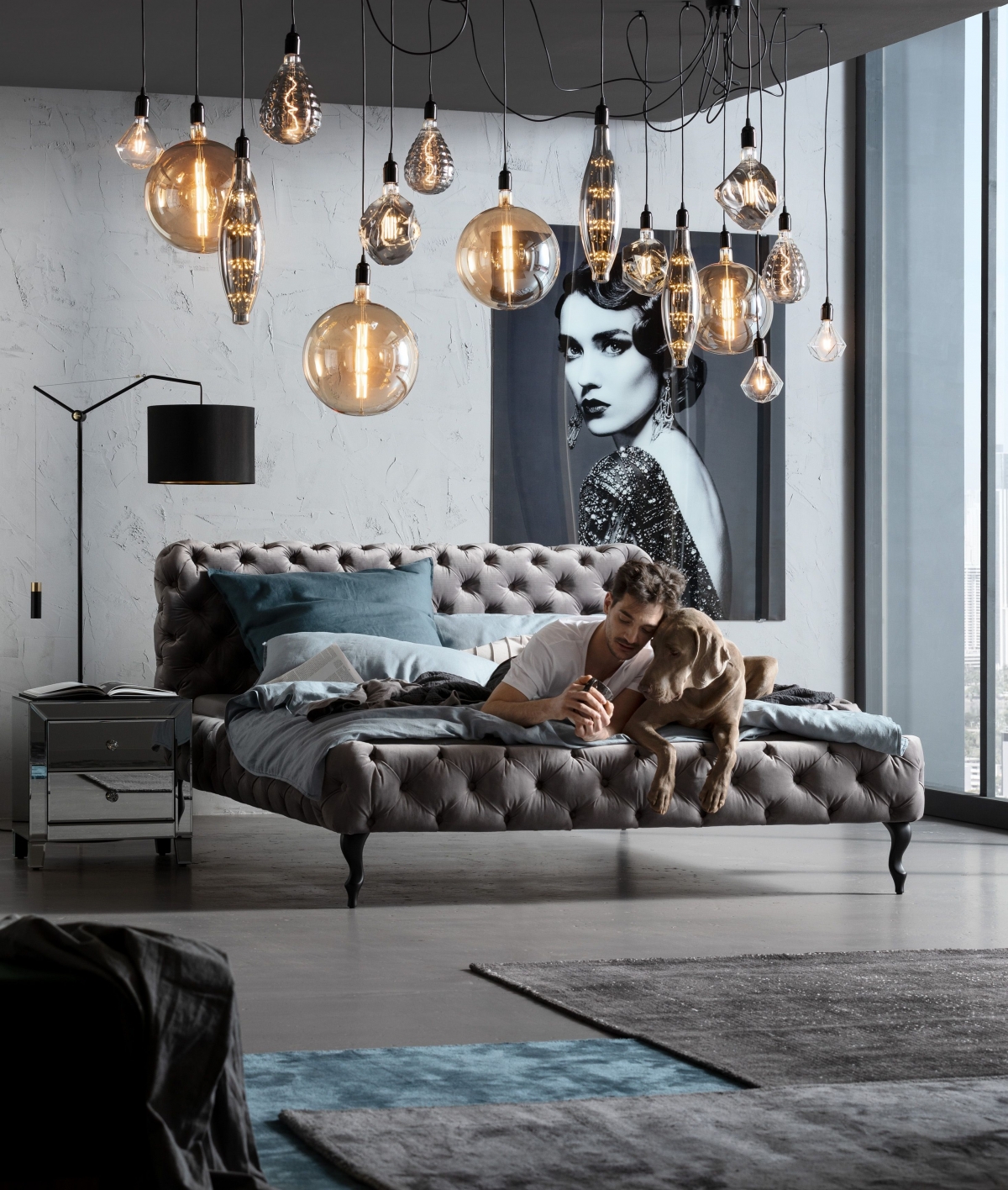 Напольное покрытие может похвастаться изобилием уютных классических ковров — от вискозных темно-синего и серого до шоколадного полиэфирного. Они образуют гармоничное трио, заботливо укрывающее полы в спальне. Потрясающее футуристическое освещение выражает череда разноплановых диодных подвесных светильников. Они выполнены в форме сияющих алмазов, огненных вытянутых овалов, мерцающих медальонов и рельефных зеркально-матовых композиций. Дополнением служит элегантный высокий торшер Salon с традиционным выключателем и удобной, устойчивой основой черного цвета.
