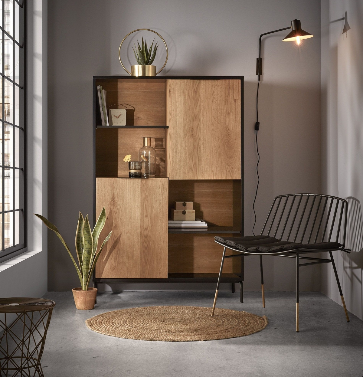 Асимметричный книжный шкаф Savoi в скандинавском стиле объединяет светлый натуральный оттенок древесины и благородный черный. Две открытые полки и пара стеллажей со створками — отличный набор для размещения всех книг. Черная банкетка Siena на стальном каркасе с золотистыми ножками и широким мягким сиденьем — удобная находка для того, кто привык к комфорту. Прямо над ней деликатно размещается настенная лампа Aria с металлическим, прочным плафоном черного цвета. У эстетичного бра легко отрегулировать угол наклона для бескомпромиссного и продолжительного чтения.